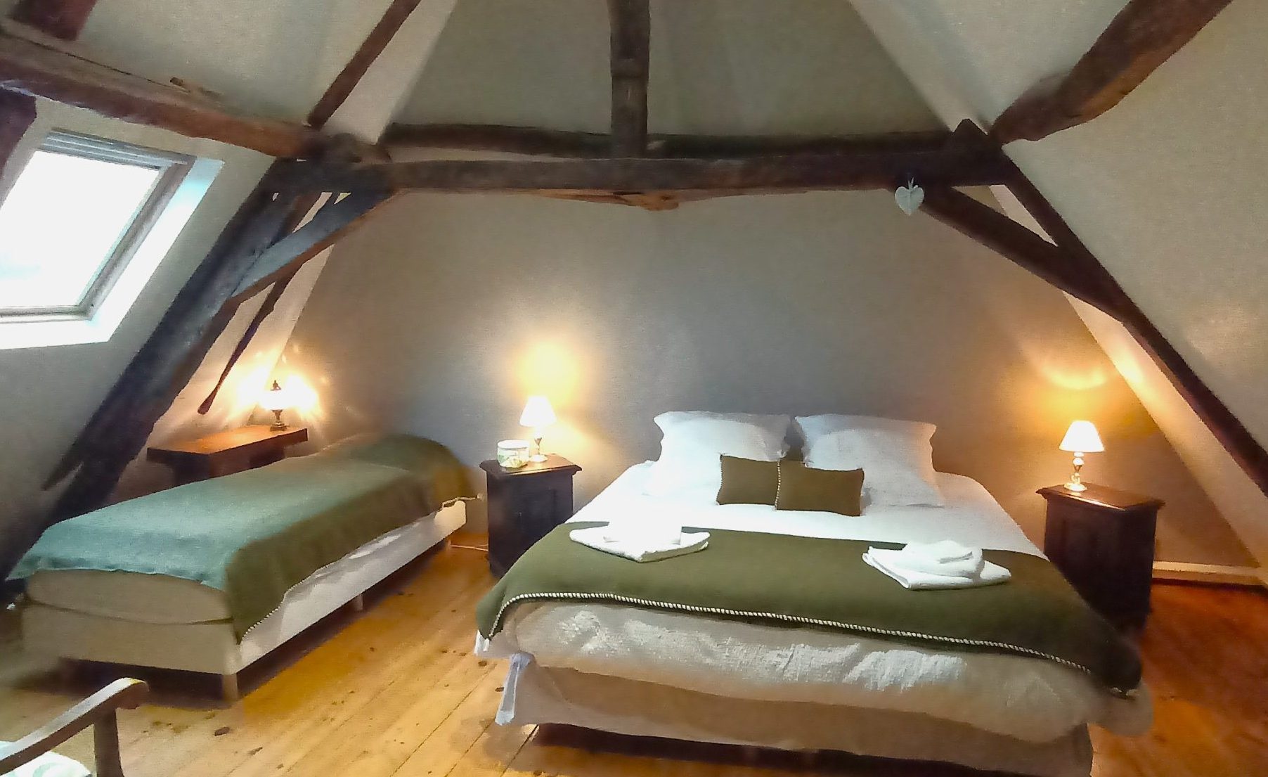 Ce gîte offre une chambre familiale avec 1 lit double (180x200) et 1 lit simple (90x200) en mezzanine et 1 couchage dans un canapé convertible au rez-de-chaussée (130x190).
